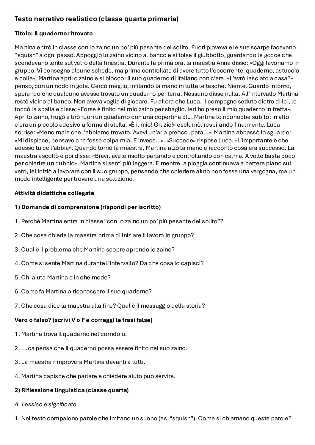 Testo narrativo + Esercizi di grammatica cl. 4